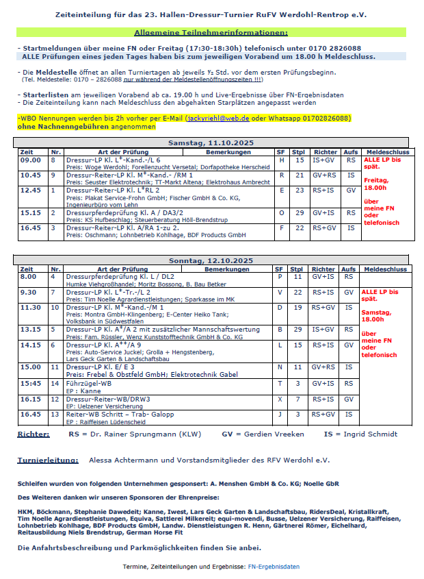 Die Zeiteinteilung für unser Dressurturnier ist online.